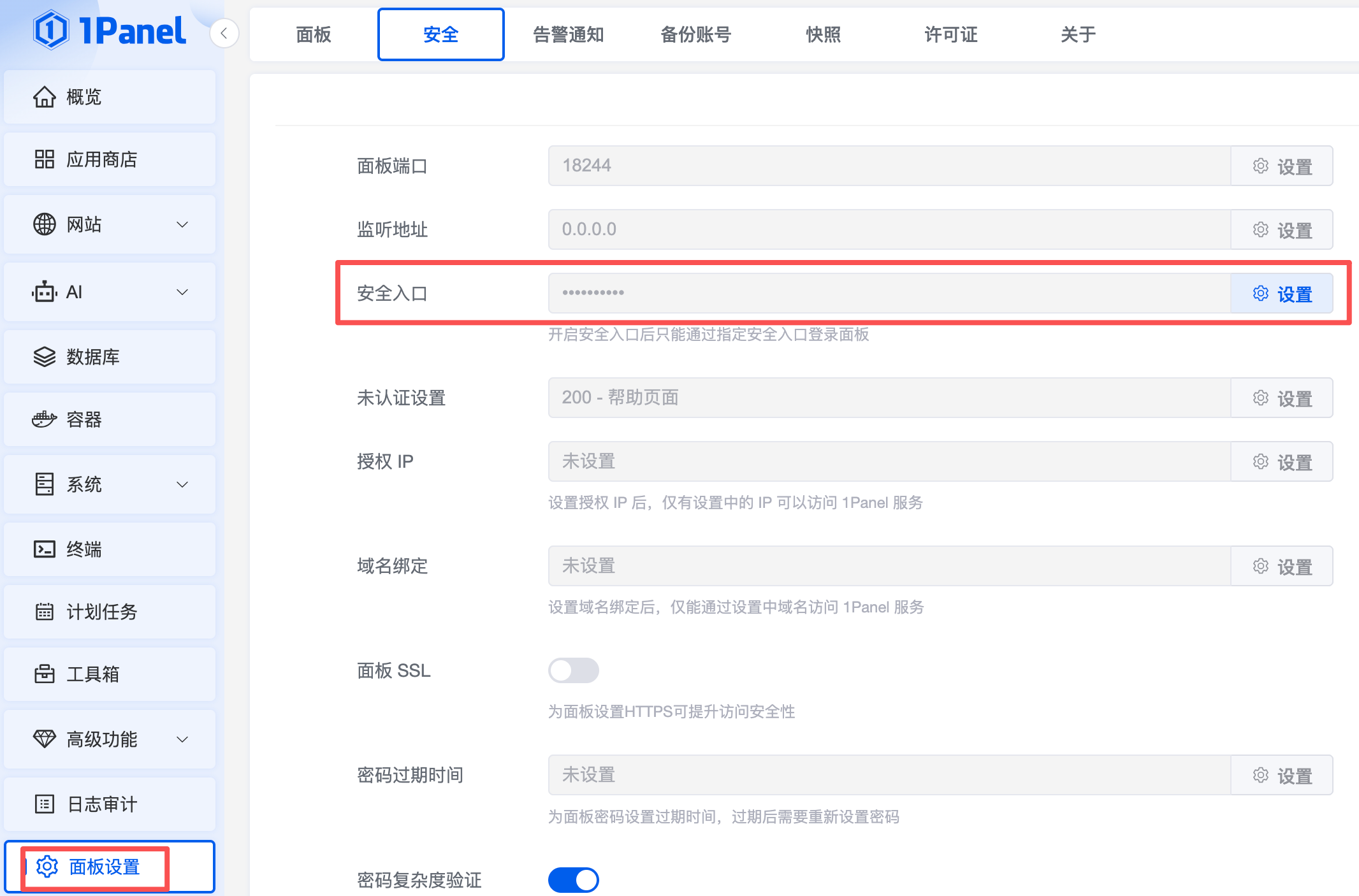 访问http://192.168.1.187:18244/404ffbaacf,在【面板设置】-【安全】-【安全入口】-【设置】中去掉安全入口码,点击确认即可。