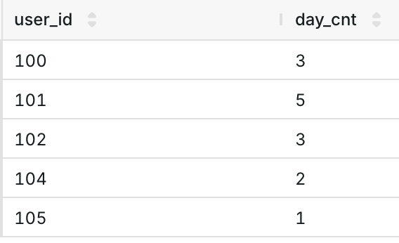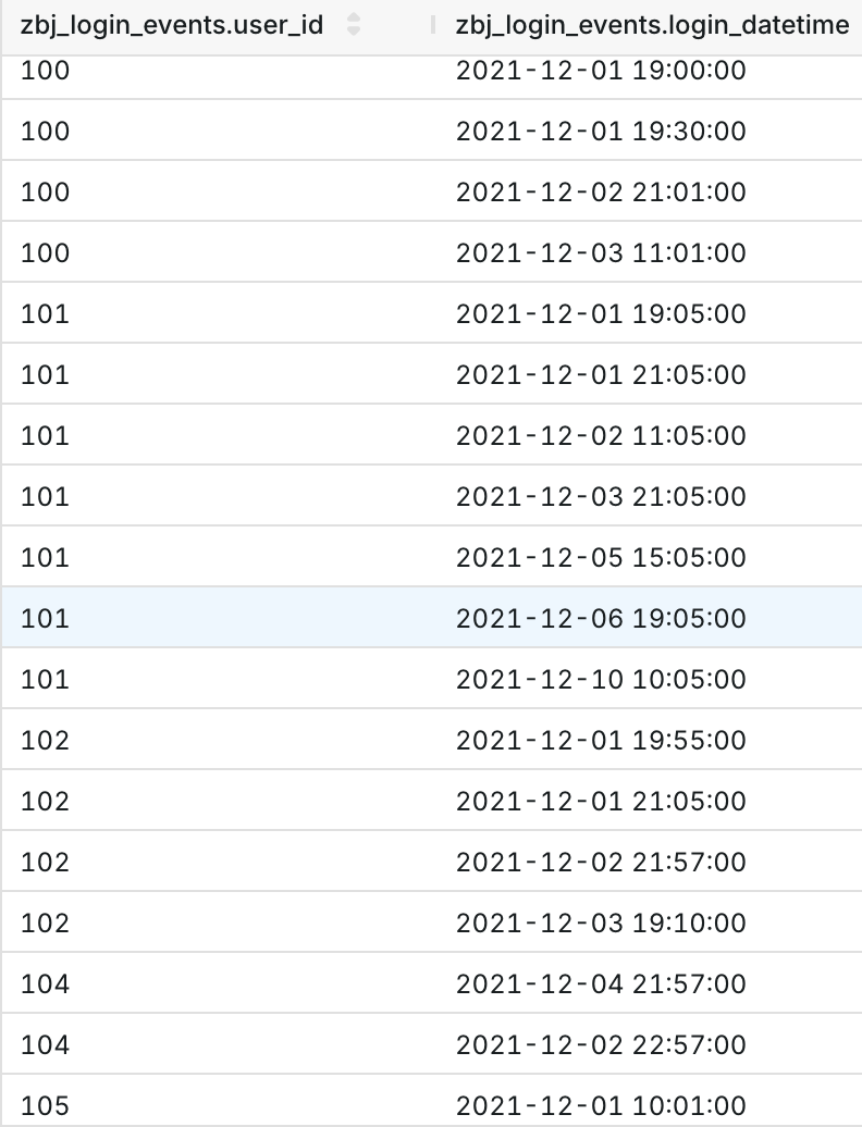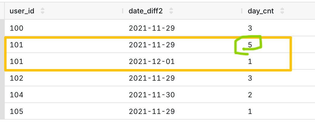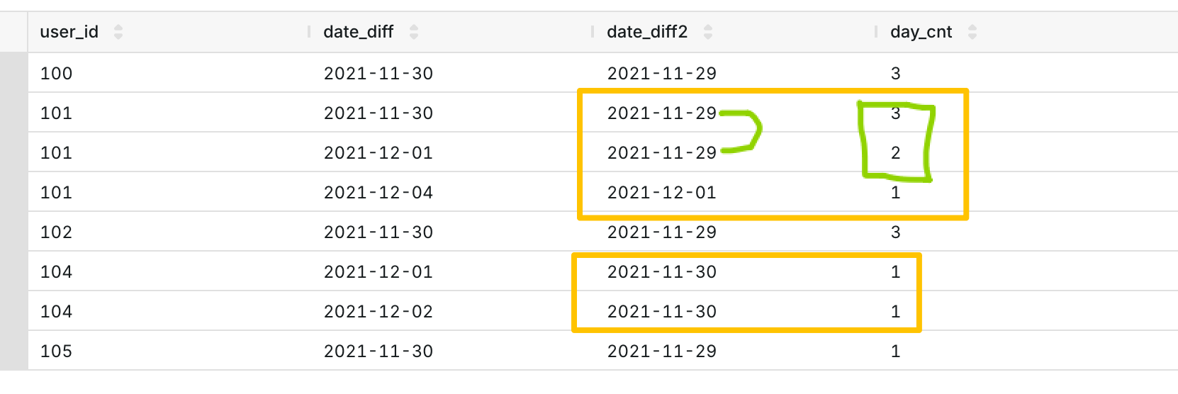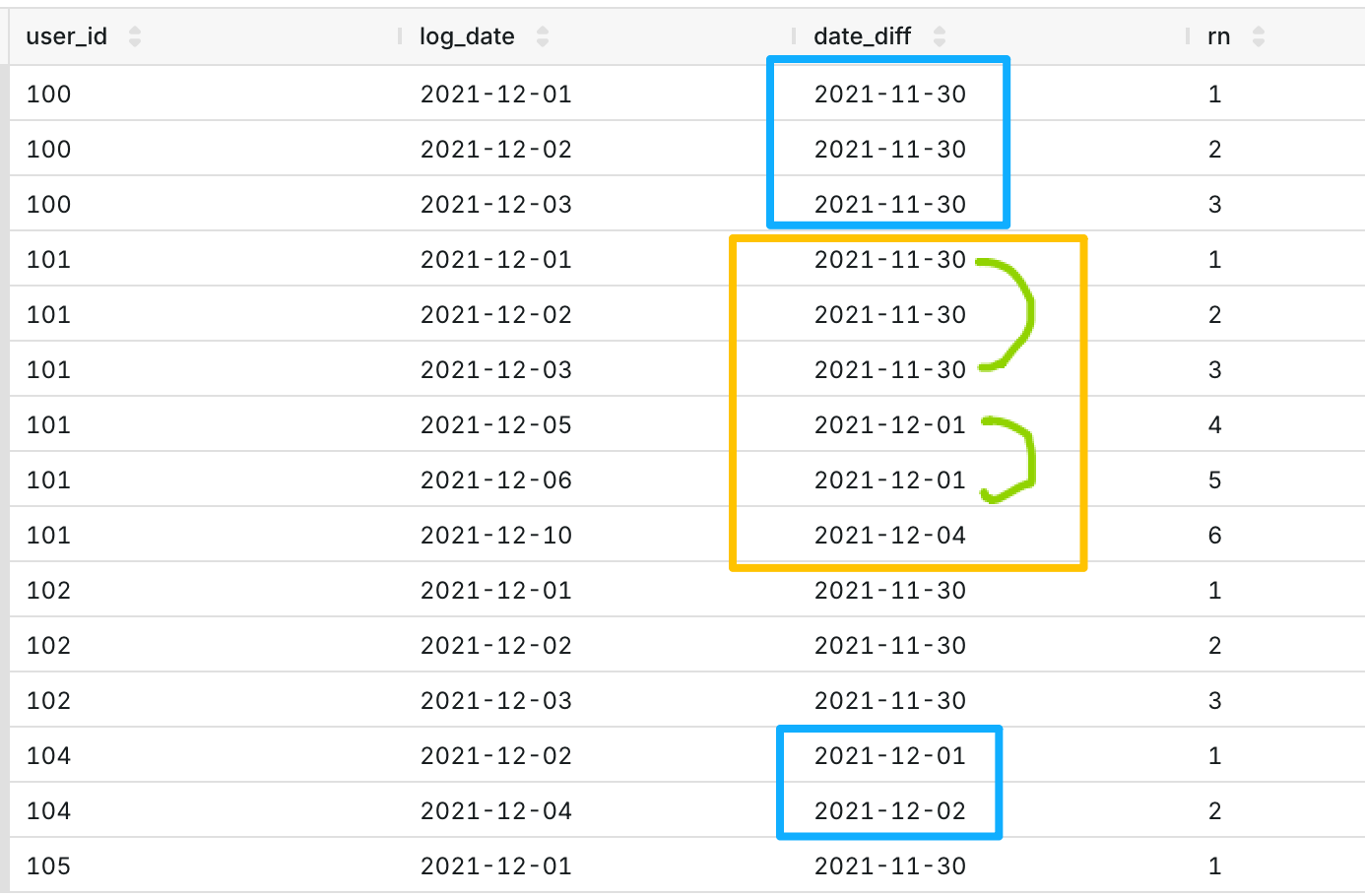 可以发现一个规律:如果连续登录则date_diff相同,如果登录日期相隔一天则date_diff也相隔一天,比如user_id:101的date_diff有2021-11-30和2021-12-01,那么这两个时间段相隔一天。