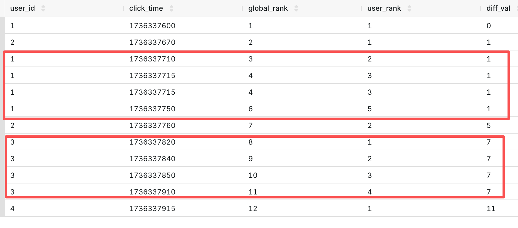 看下图总结一下规律:如果一个用户连续点击中间没有其他用户,那么全局序号(global_rank)和用户序号(user_rank)的差值相同。见下面图中的两个红框,分别是用户1和用户3连续点击的情况。