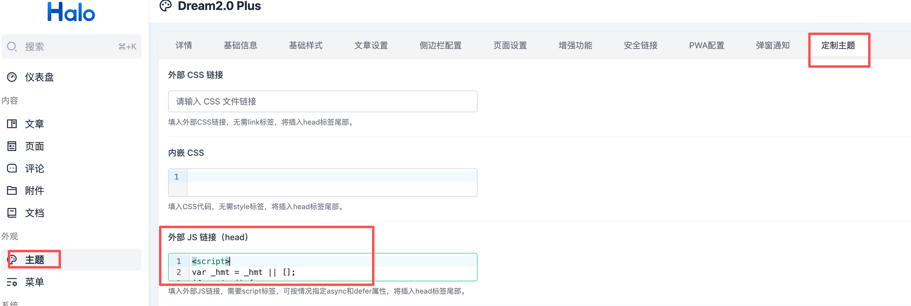 settings.yaml文件或后台可视化设置中提供了专门的字段来粘贴第三方统计代码或输入站点ID。打开你当前使用的主题的设置(通常在 Halo 后台 -> 外观 -> 主题 -> 定制主题 )。