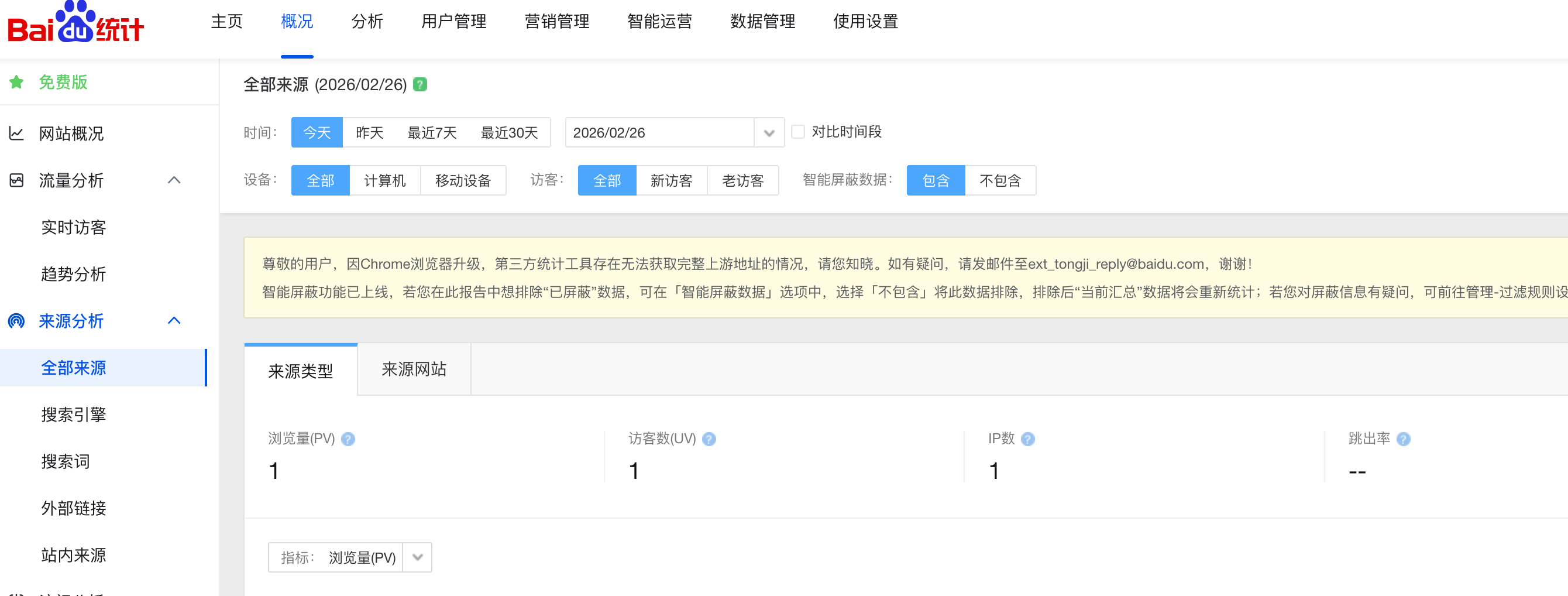 概况: 提供每日/每周/每月的核心指标,如 PV、UV、IP、跳出率、平均访问时长等。