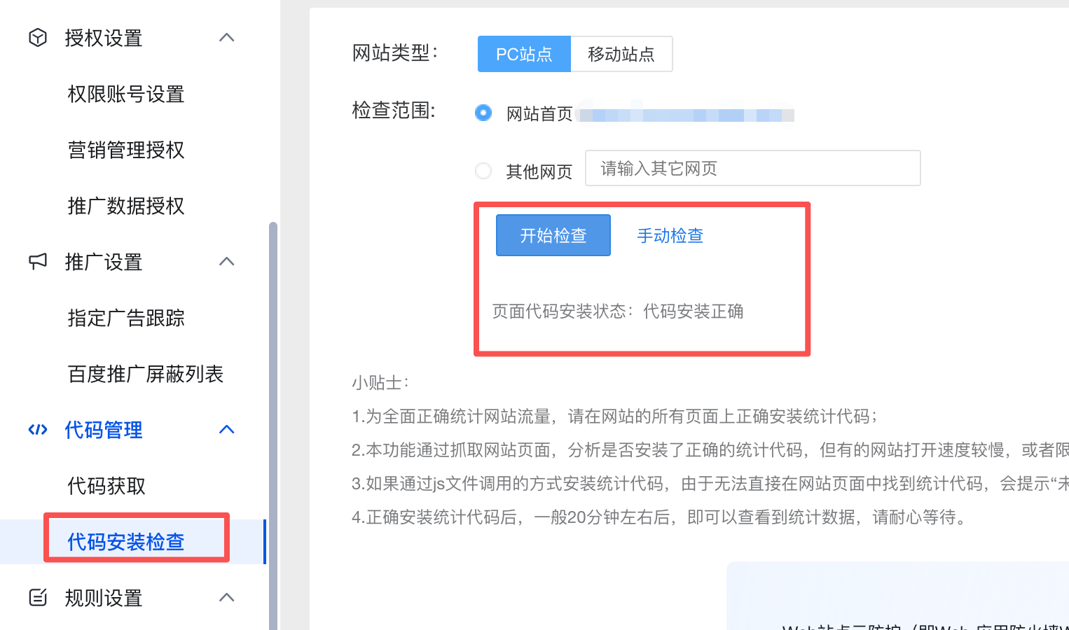 可以通过百度统计的代码安装检查功能,检查配置是否成功: